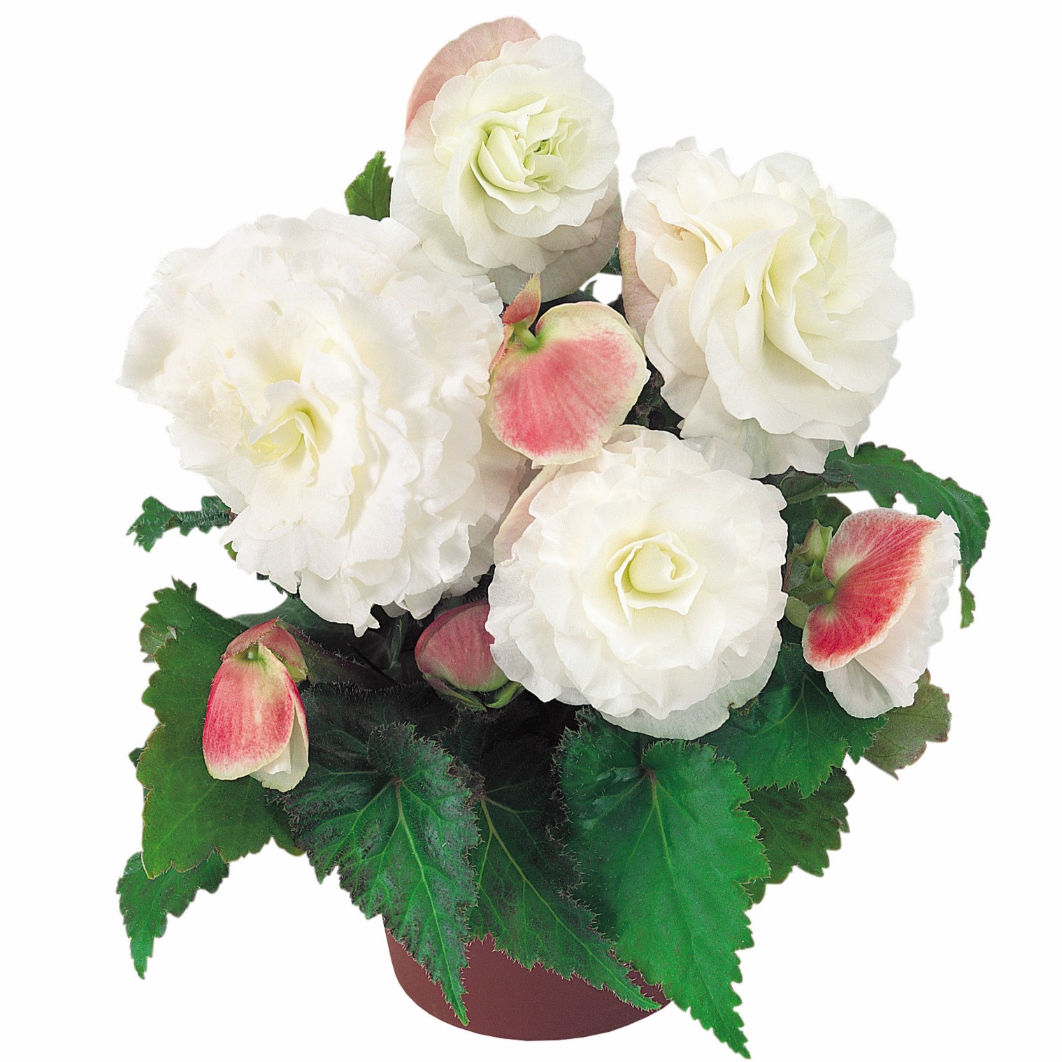 Begonia ‘Nonstop Apple Blossom’ produces vibrant, fully double flowers in creamy white delicately edged with shell pink, closely resembling apple blossoms. Part of the popular Nonstop series, this variety forms neat, compact plants with fresh green foliage and an abundance of large blooms throughout the summer. Perfect for borders, pots, and containers, it flowers continuously until the first frosts, providing long-lasting colour