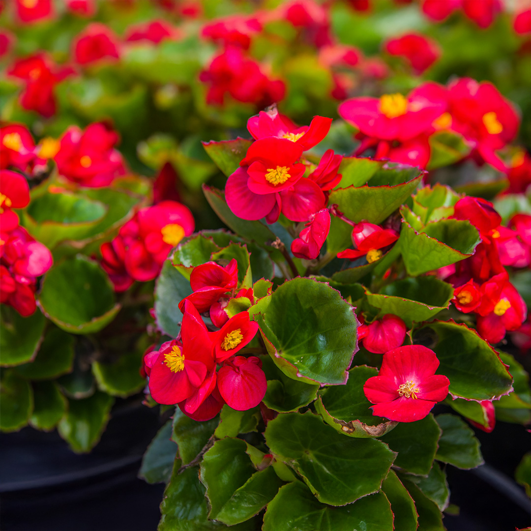 Begonia (Semperflorens) ‘Heaven Red’ F1 is a compact, bushy annual with vibrant red flowers. Ideal for borders, containers, or bedding, it blooms continuously through summer.
