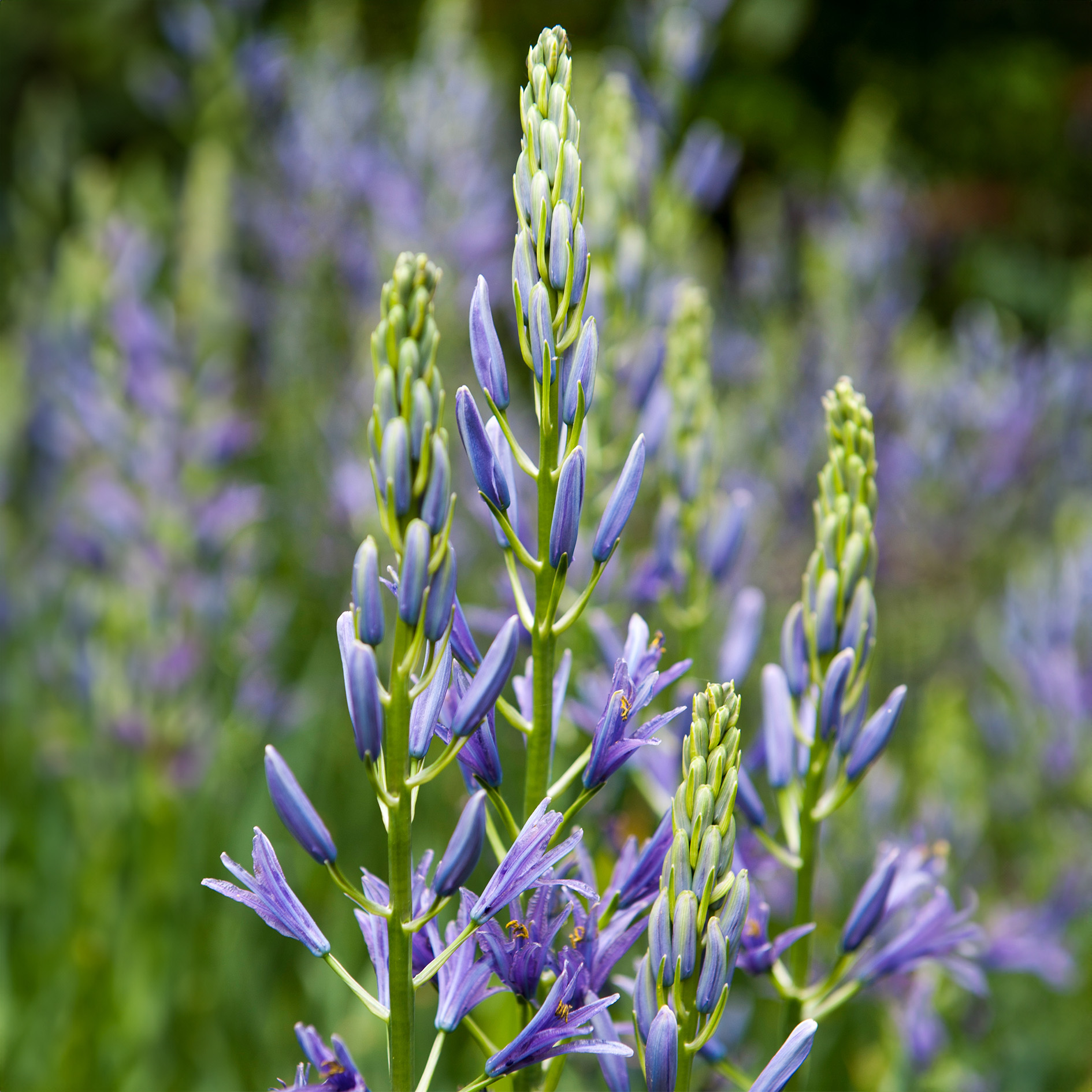 Camassia quamash is an early summer-flowering bulb that produces upright stems with star-shaped, deep blue to violet blooms. Reaching a height of around 40cm and is ideal for borders, meadows, and naturalistic planting schemes. This hardy perennial thrives in moist, well-drained soil and performs best in full sun to partial shade. Ideal for planting in drifts or among grasses and other wildflower species due to it attracting pollinators.