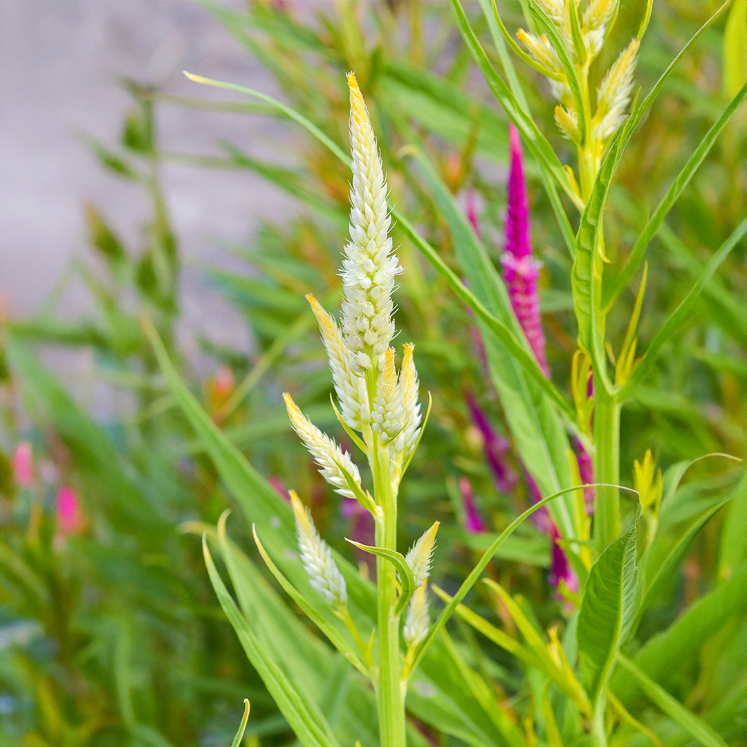 Celosia ‘Celway White’ is an elegant variety with strong stems that bear one central flower spike surrounded by several smaller side spikes. Unlike the ruffled, crested form of traditional celosia, this variety produces sleek, feathery plumes for a more refined and modern look. The spikes are silvery with a touch of pale lemon, adding light and texture to borders, beds, and containers. Long-lasting and versatile, ‘Celway White’ is also excellent for cutting, as well as for fresh or dried arrangements.