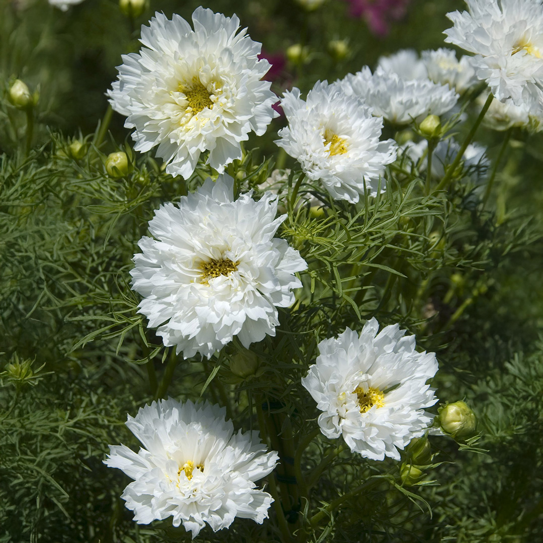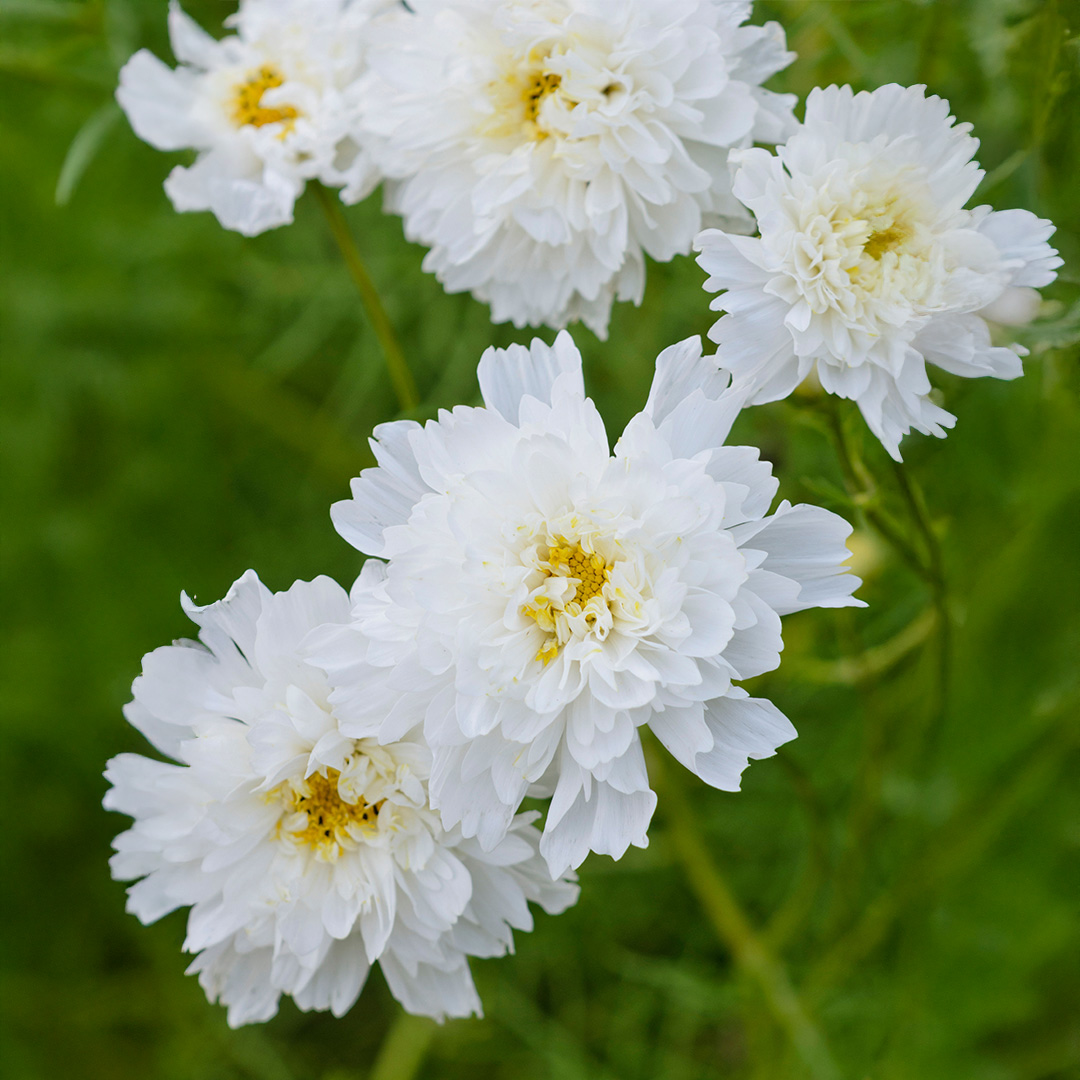 Cosmos ‘Double Click Snowpuff’ produces fully double, snow-white, pom-pom-like blooms that may show a faint blush of pink. The flowers grow on sturdy branching stems with feathery foliage, making them attractive in the garden and useful for cutting. This variety adds charm and long-lasting colour to borders, cottage gardens, and bouquets.