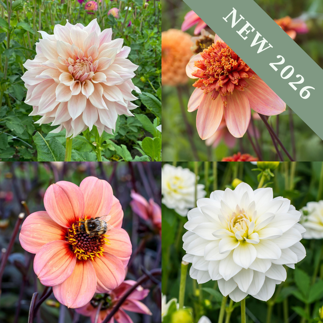 The Bestsellers Dahlia Collection brings together four of our most popular varieties: Café Au Lait, Totally Tangerine, White Onesta, and Happy Single Kiss.