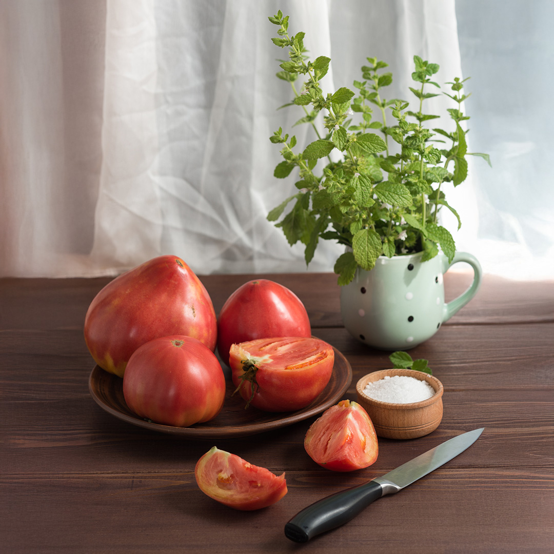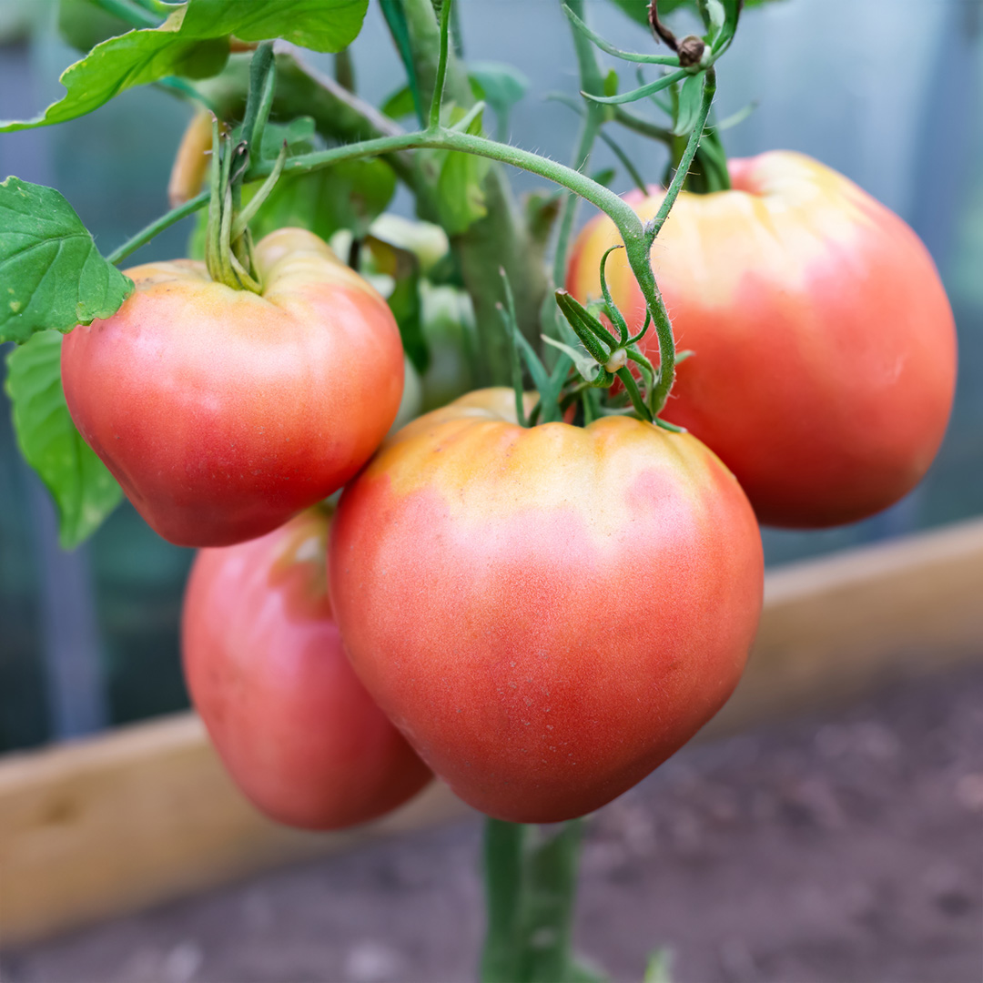 The famous “Oxheart” tomato producing large, meaty fruits up to 1lb in weight. Fruits are ox heart shaped, with a rounded base, ribbed, and ripen to an orangey-red colour with a delicious sweet taste. Ideal for slicing with a superb flavour.