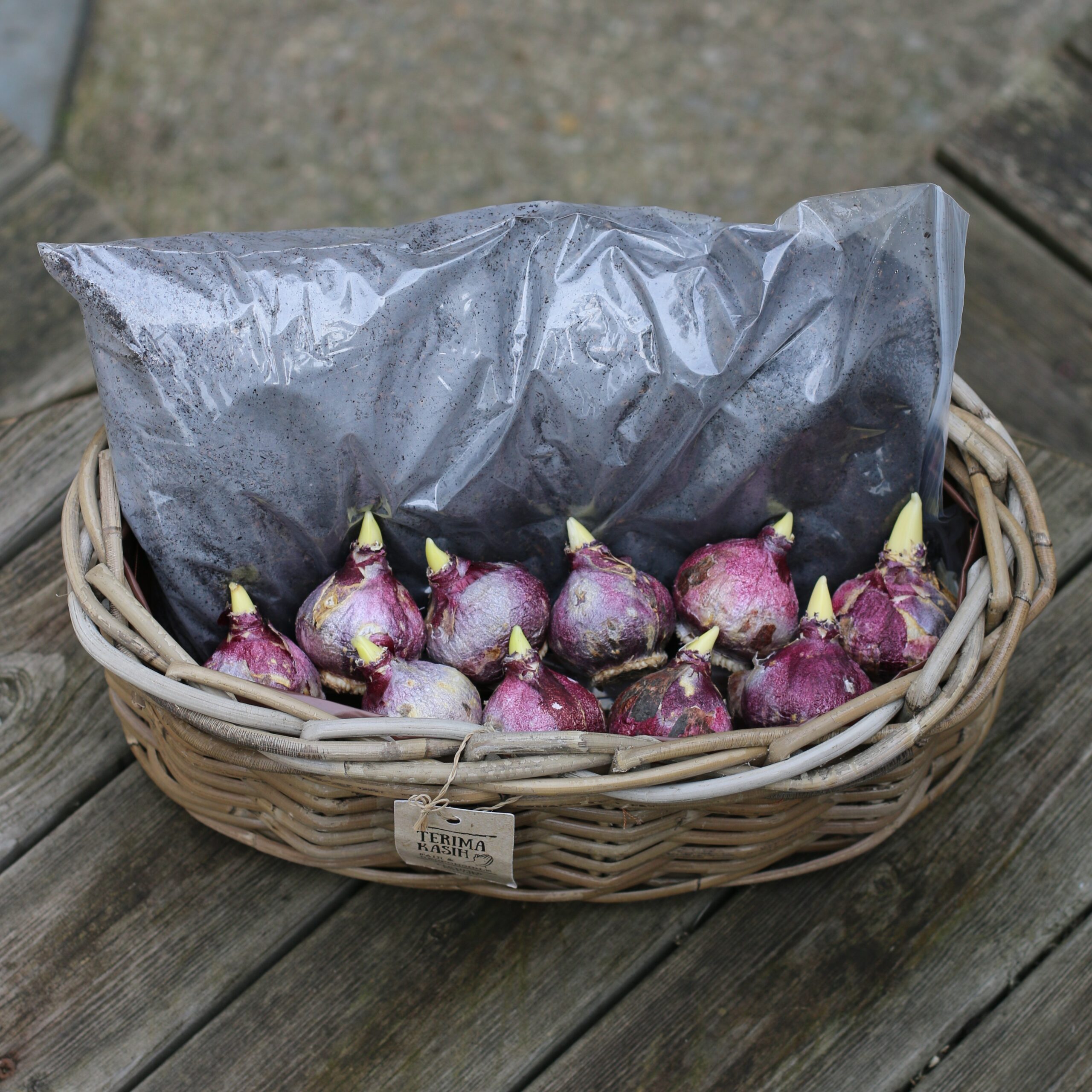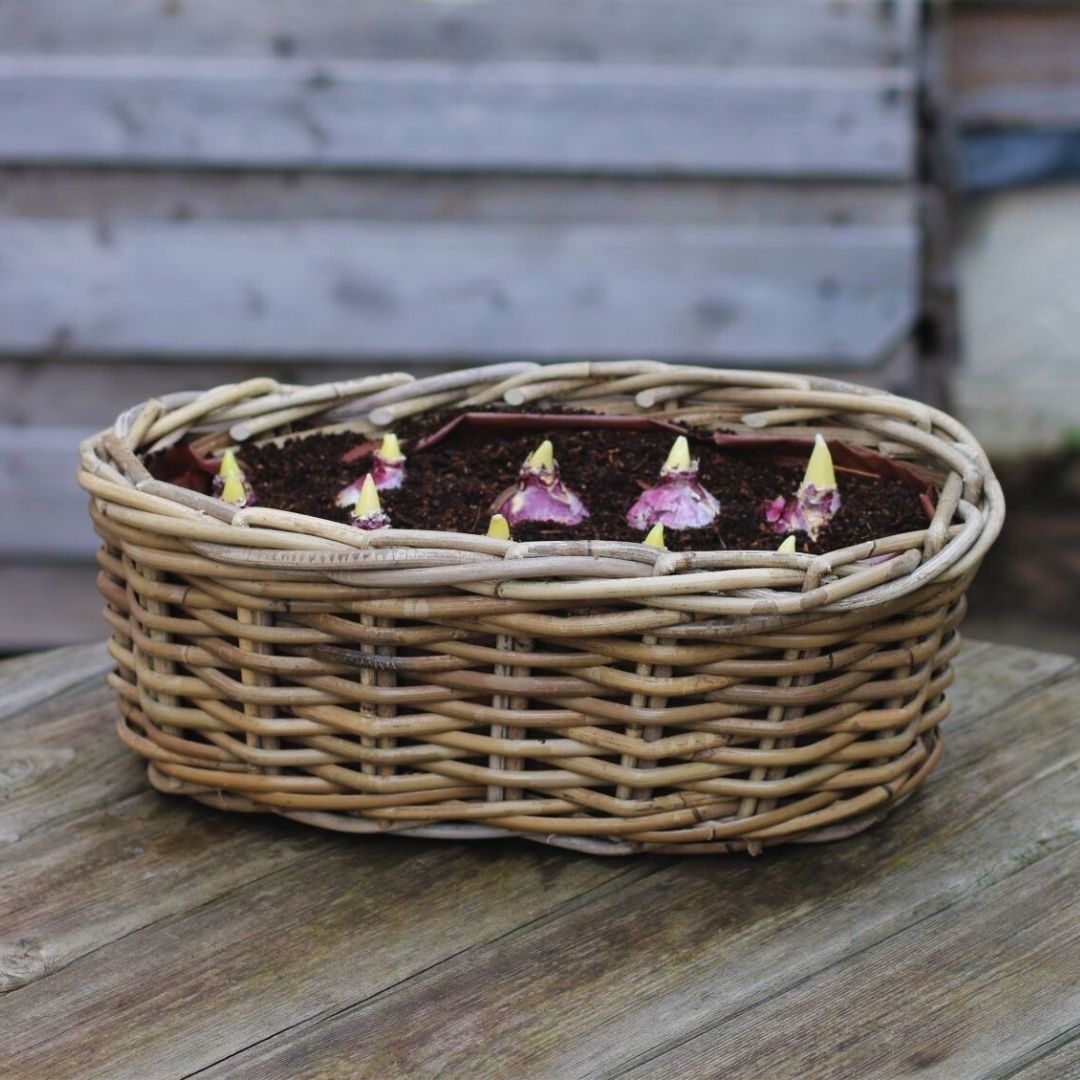 Start your indoor displays with our oval basket indoor hyacinth bundle. This bundle includes an oval rattan basket, compost, and ten Hyacinth Carnegie bulbs.