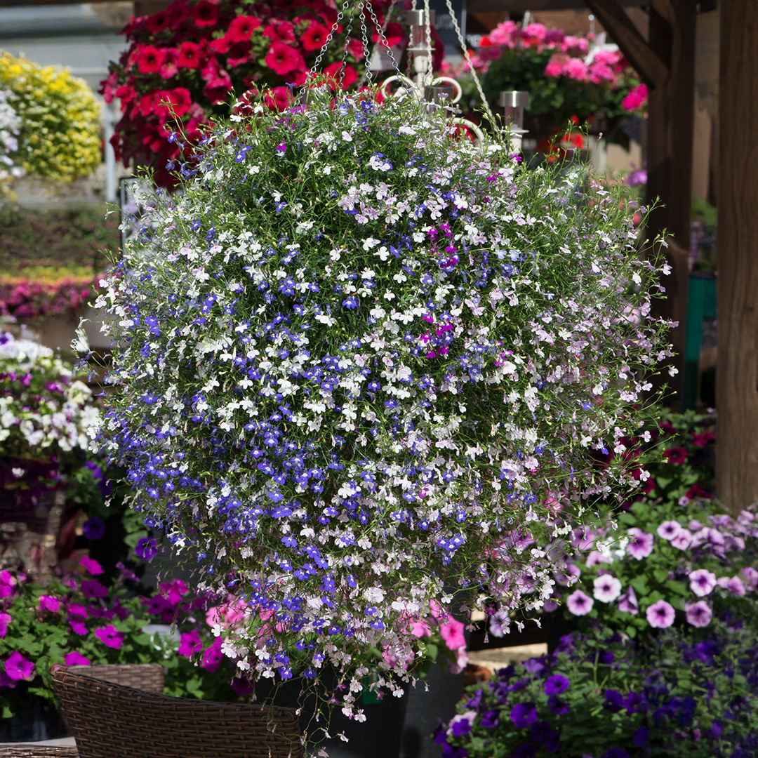An essential part of every hanging basket or container, Lobelia Fountains Mix delivers a stunning display of vigorous trailing plants flowering until the first frost from the popular series (Blue, Crimson, Lilac, Rose, white and sapphire).