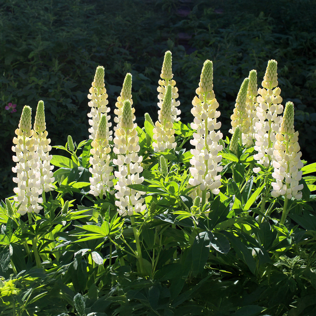 Lupin (Russell) ‘Noble Maiden’ is a perennial with tall spikes of ivory to pure white flowers. Perfect for sunny borders, cottage gardens, or mass plantings, it blooms from spring to summer and is excellent for cutting.