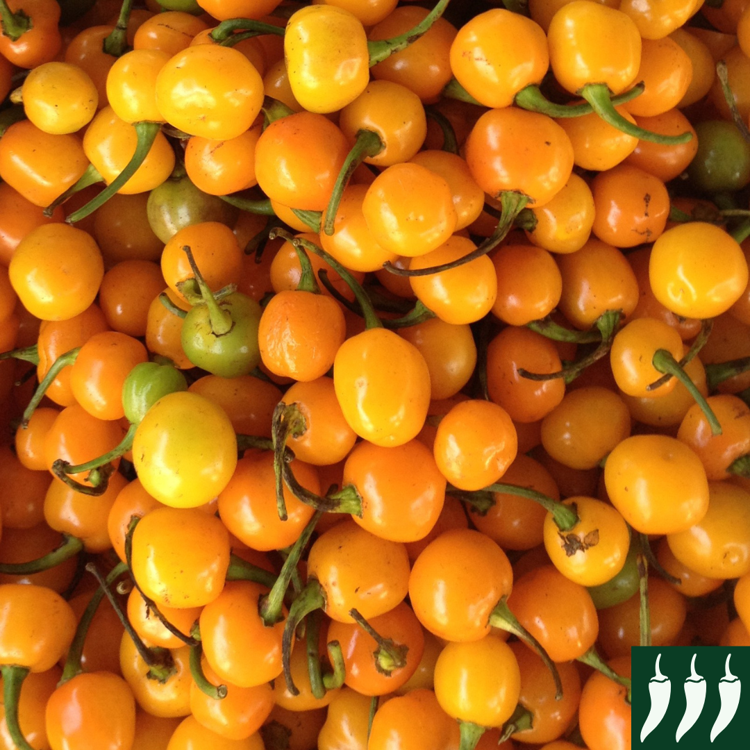 An early maturing and productive hot cherry variety, Orange Koral ripens  from dark green to an orange-yellow at maturity with a heat of 40,000 Scoville’s.  The fruits average 2cm in diameter  and 15-20 grams. Best under glass in the UK or a very sheltered spot outdoors in full sun.
