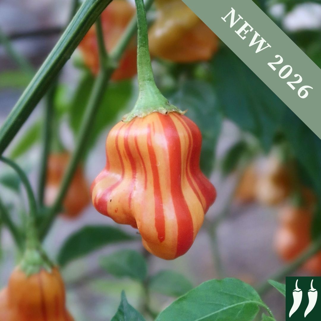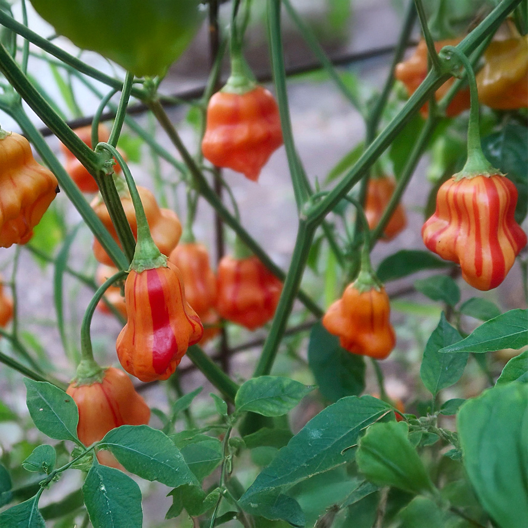 Pepper ‘Zebrange’ is a compact, productive variety ideal for containers or small gardens. It produces elongated, striped fruits that range from orange with red stripes to fully red. Crisp and crunchy, these peppers are perfect for snacking, stir-fries, or pickling. This unique variety is a cross between Aji Fantasy and Christmas Bell.