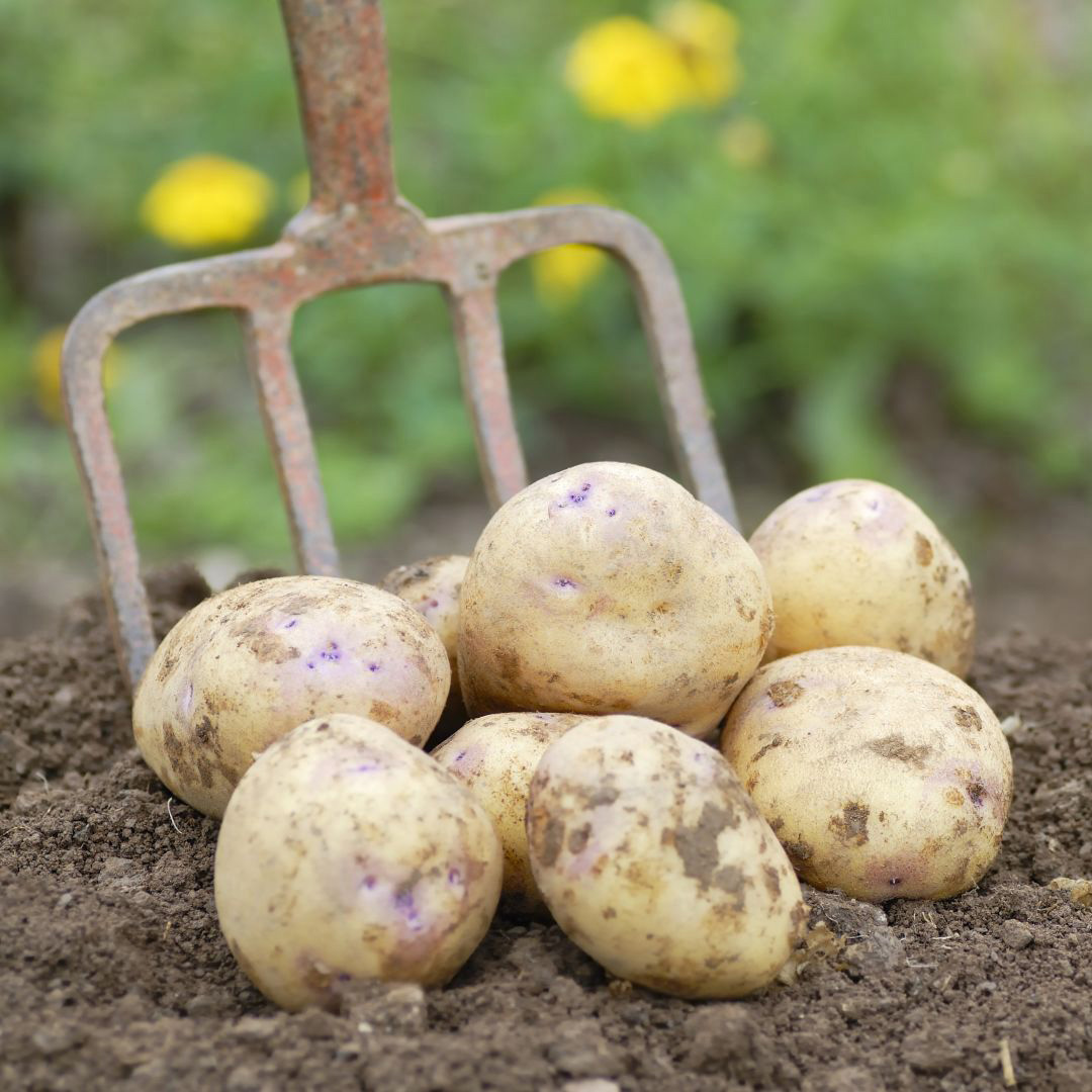 Potato ‘Kestrel’, a recent variety that is quickly becoming renowned for its delicious taste and good resistance to blackleg, as well as potato virus, slugs, eelworm and bruising. These potatoes consistently produce large tubers with striking blue eyes.