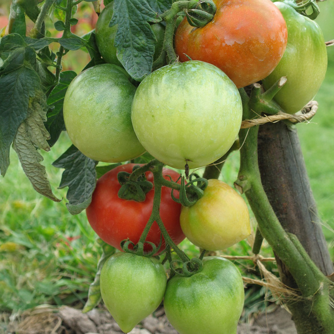 Determinate tomatoes, or “bush” tomatoes, are varieties that grow to a compact height (generally 3 – 4′). Determinates stop growing when fruit sets on the top bud. All the tomatoes from the plant ripen at approximately the same time (usually over period of 1- 2 weeks). They require a limited amount of staking for support and are perfectly suited for container planting.