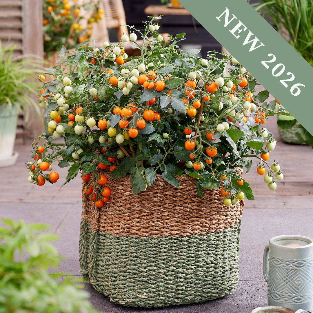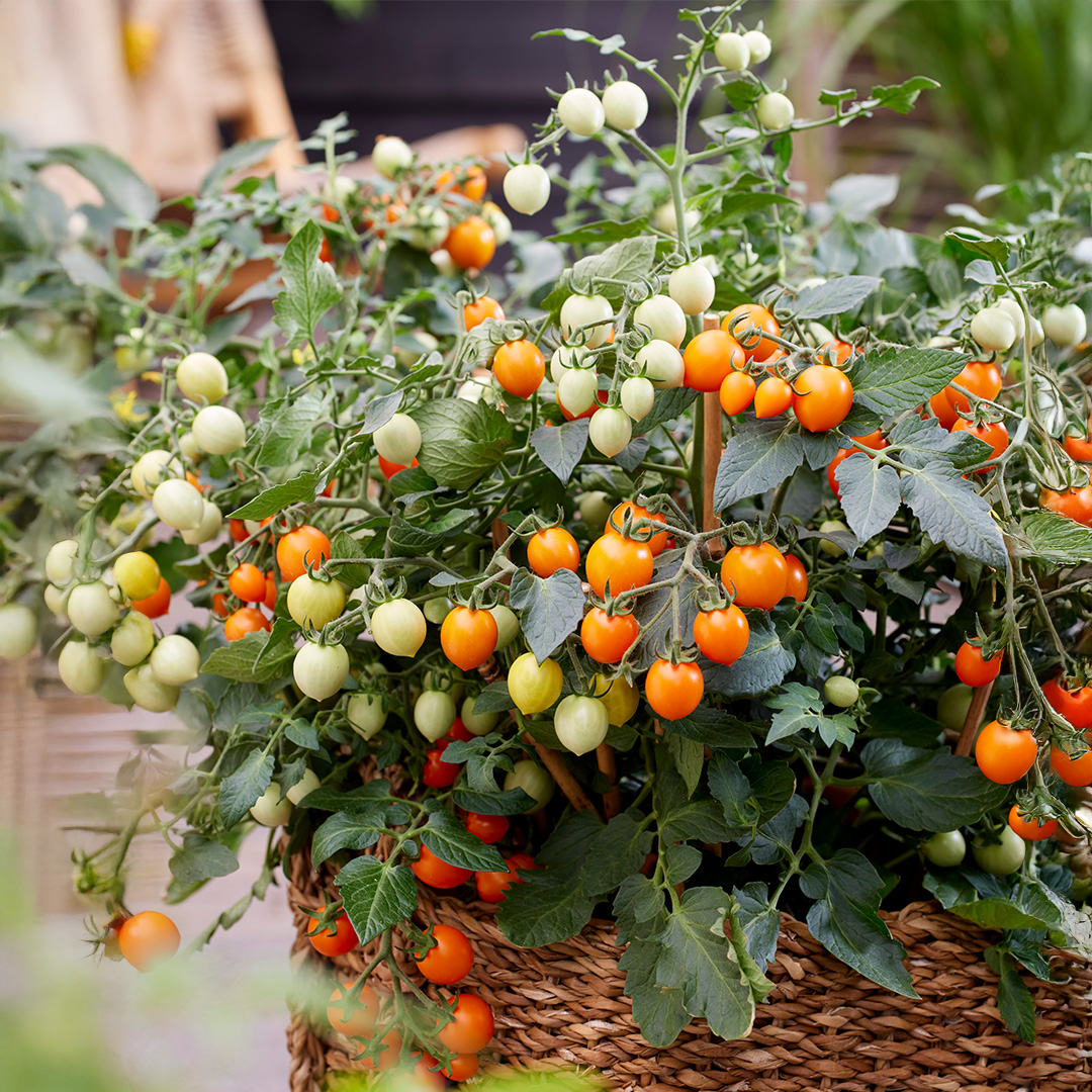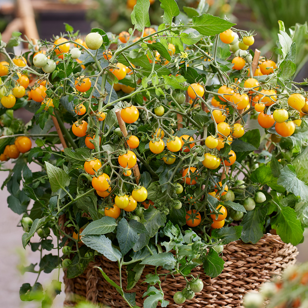 Tomato ‘Tiny Temptations Orange’ is a compact cherry tomato variety that produces an impressive 250-300 small, sweet fruits per plant. It’s perfect for snacking, salads, or fresh eating, and its compact size makes it ideal for containers, balconies, or small garden spaces.