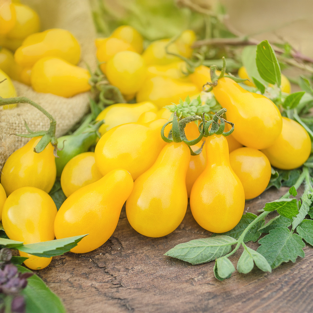 Tomato ‘Yellow Submarine’ is an heirloom variety with bright yellow, pear-shaped fruits around 3cm long and 15 to 20 grams in weight. This indeterminate plant can grow up to two meters tall and has a sweet, low-acidic flavour.