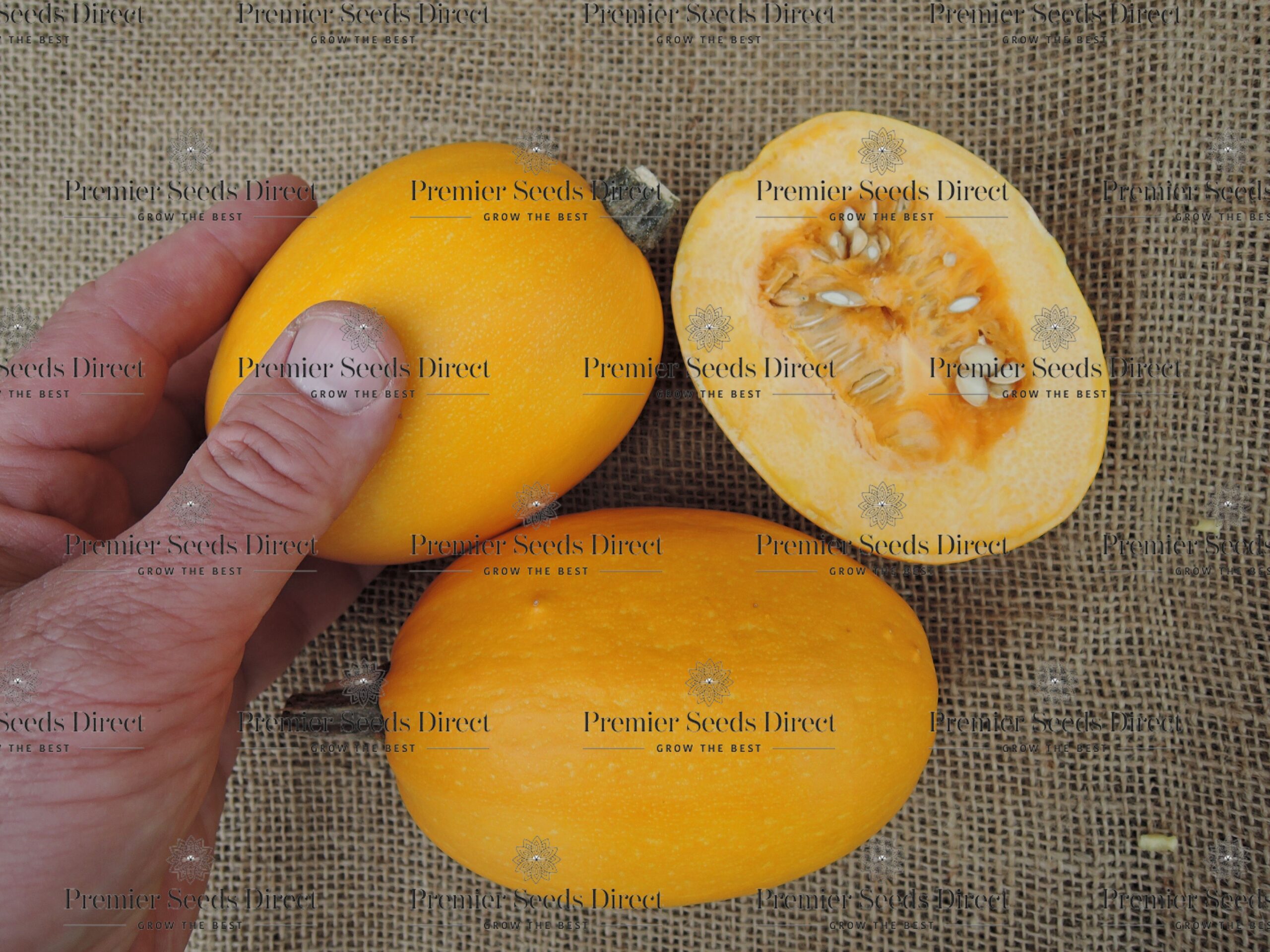 An early maturing mini spaghetti squash variety with a semi-vigorous plant habit. It matures around 2 weeks earlier than standard larger varieties. The fruits are uniform egg shaped 400-600 gram each yielding 15-20 per plant. The flesh is a pale yellow -orange with an excellent nutty flavour. Will store well into winter. Boil or roast the fruit whole for 20-30 minutes, remove the seeds, then fork out the spaghetti like flesh in long strands, serve with a sauce or season to taste, delicious.